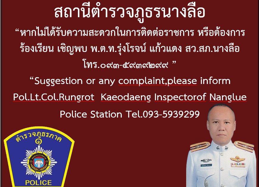 “หากไม่ได้รับความสะดวกในการติดต่อราชการ หรือต้องการร้องเรียน เชิญพบ พ.ต.ท.รุ่งโรจน์ แก้วแดง สว.สภ.นางลือ
